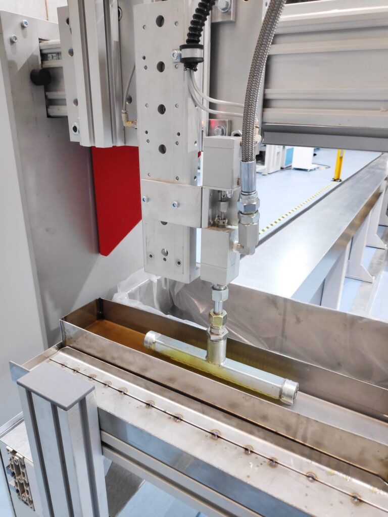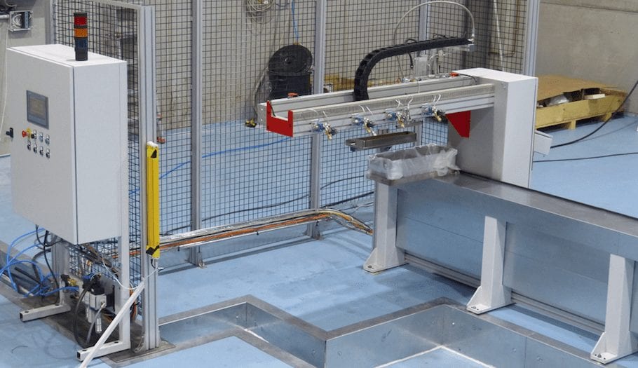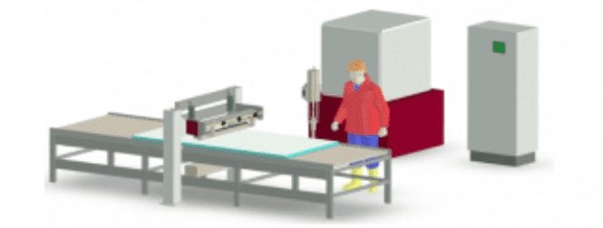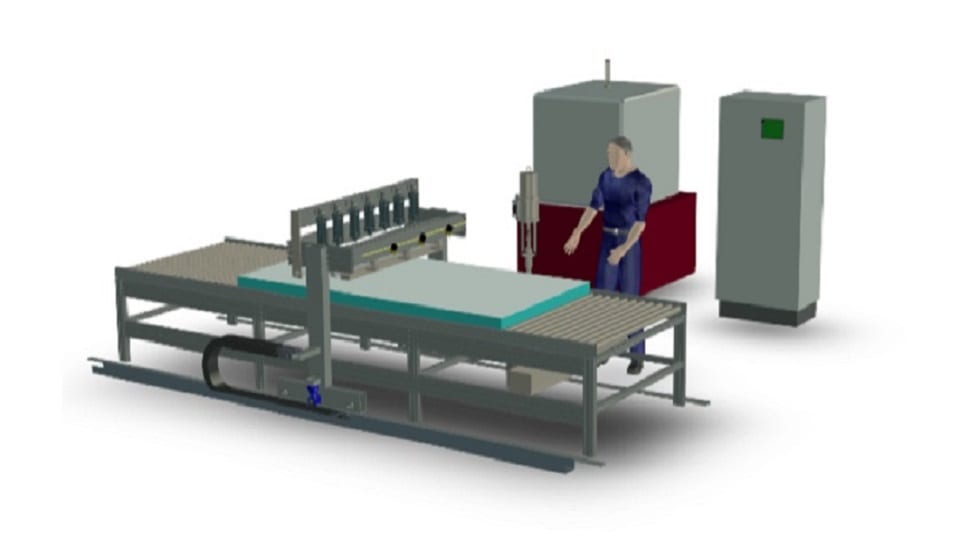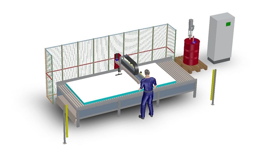 1 off automatic system for pumping and spreading of one component moisture cured polyurethane. The system will work together with a vertical lifting table where the panels are stacked. The system applies the adhesive in beads on a square surface (the panel).