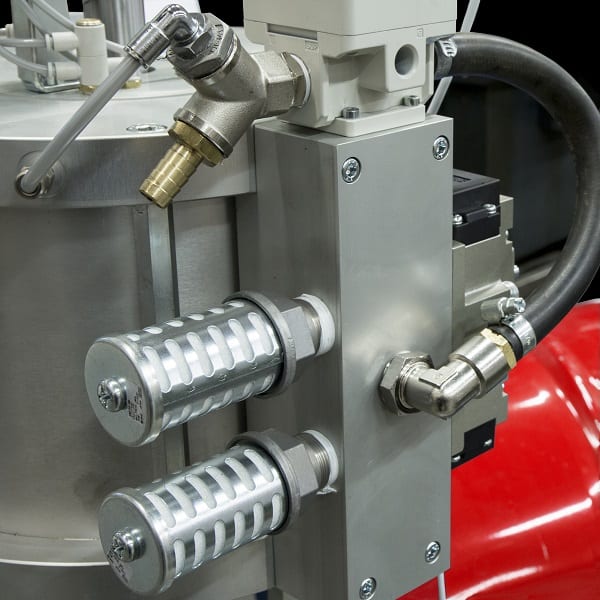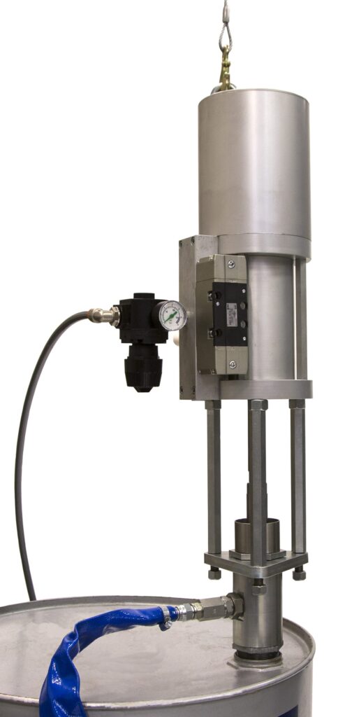As a standard feature the base component is stirred through a pneumatic driven agitator to prevent sedimentation in the drum.