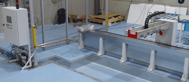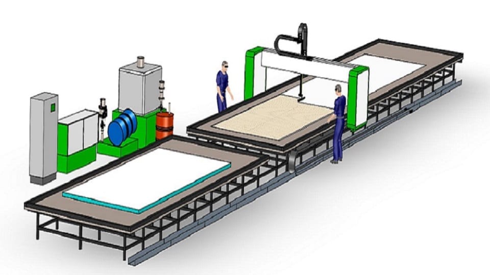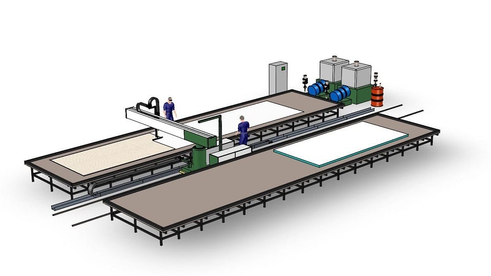 The M4 system is an automatic spreader system for one, two or three component adhesives. The machine will automatically apply the adhesive over a programmed surface area meanwhile the operators prepare the next layer or inserts the insulation into the panel as the machine moves down the panel length. M4 is specifically designed for an efficient manufacturing of large sandwich panels and for the right customer the system will enable a substantial increase of productivity.