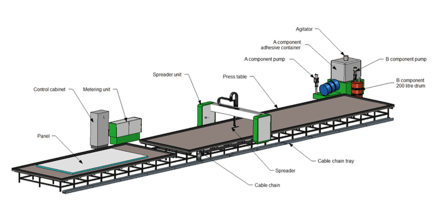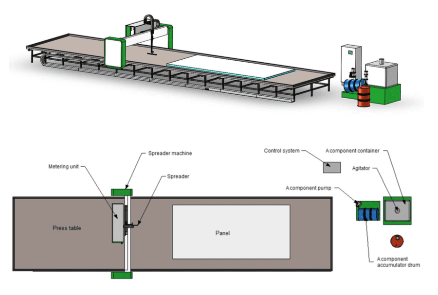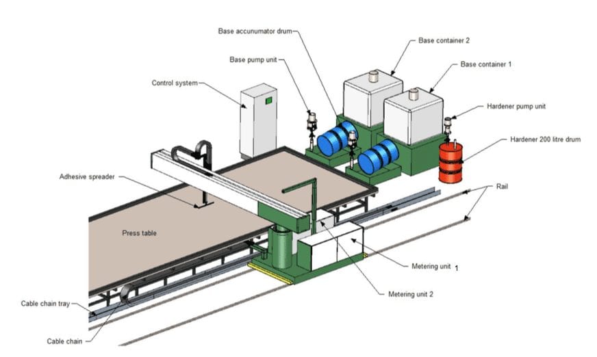 On the spreader unit a trolley carries the adhesive spreader and moves it perpendicular to the length of the table. In the other direction the whole machine unit moves on the table track. The adhesive is applied through the spreader across the width of the panel. Each adhesive component is pumped from an adhesive pump station positioned at the side of the production line. The pumps are air driven pistons and the mixing ratio metering is done by mechanically linked measuring cylinders.