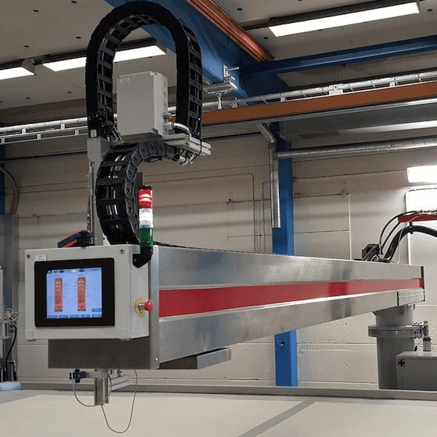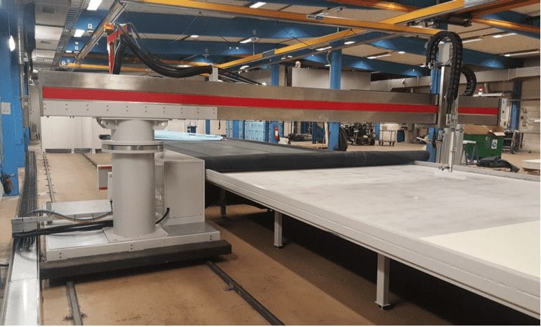 The operator programs the surface dimensions into the machines control system and then jogs the machine into starting position by guiding a laser marker. To simplify the operation the commands are performed using a hand held remote control. When in position the operator presses the start button and the machine applies the adhesive automatically on the surface area in accordance with the chosen programming and the operator can attend to preparing the next layer (or place the core material as the machine moves along the track). After the first adhesive layer is complete the process is mirrored by turning the direction switch.