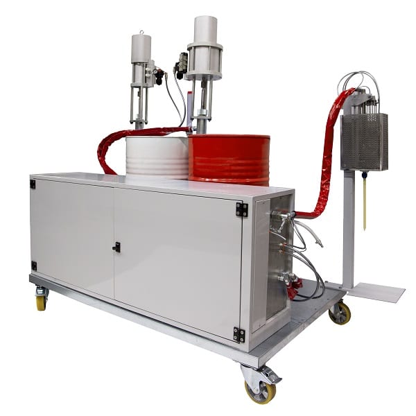 The adhesive components are pumped through pipes and hoses laid down in an energy chain at the side of the machine track with the pump station positioned at the side of the production line. The pumps are of air driven piston type and the mixing ratio metering is done by mechanically linked measuring cylinders. The spreader is of steel and can be made at any width up to 600 mm.