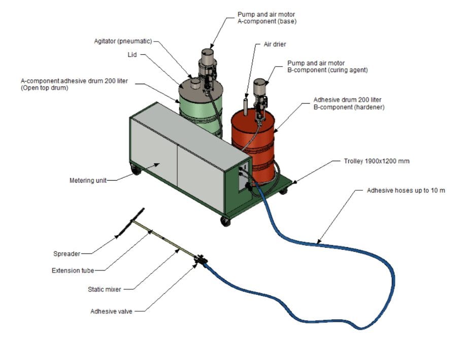 The adhesive components are pumped directly out of the 200 litre drums to the metering unit which sets the mixing ratio. The adhesive is mixed in a static mixer mounded on the outlet of the adhesive valve. The adhesive is then applied through the spreader. An extension tube between mixer and spreader allows for the operator to reach across wider panels. The metering unit together with the two adhesive drums and pumps are placed on a trolley to easily move the system around at the production site.