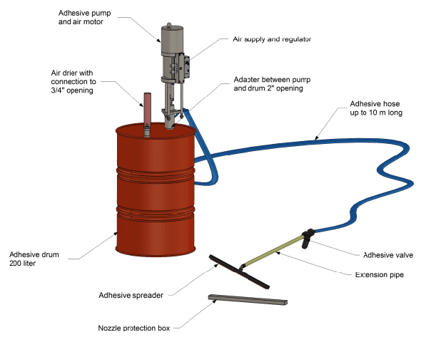 The equipment consists of a pump, a 200 liter adhesive drum, an adhesive hose, a hand-operated adhesive valve and an adhesive spreader (rake). The rake is attached to an extension tube in order to easily reach across the whole panel. The length of the hose, extension tube and spreader can be adjusted to suit the specific production conditions.When the equipment is not in use the spreader is placed in a nozzle protection box filled with inert oil to prevent the nozzle from clogging.